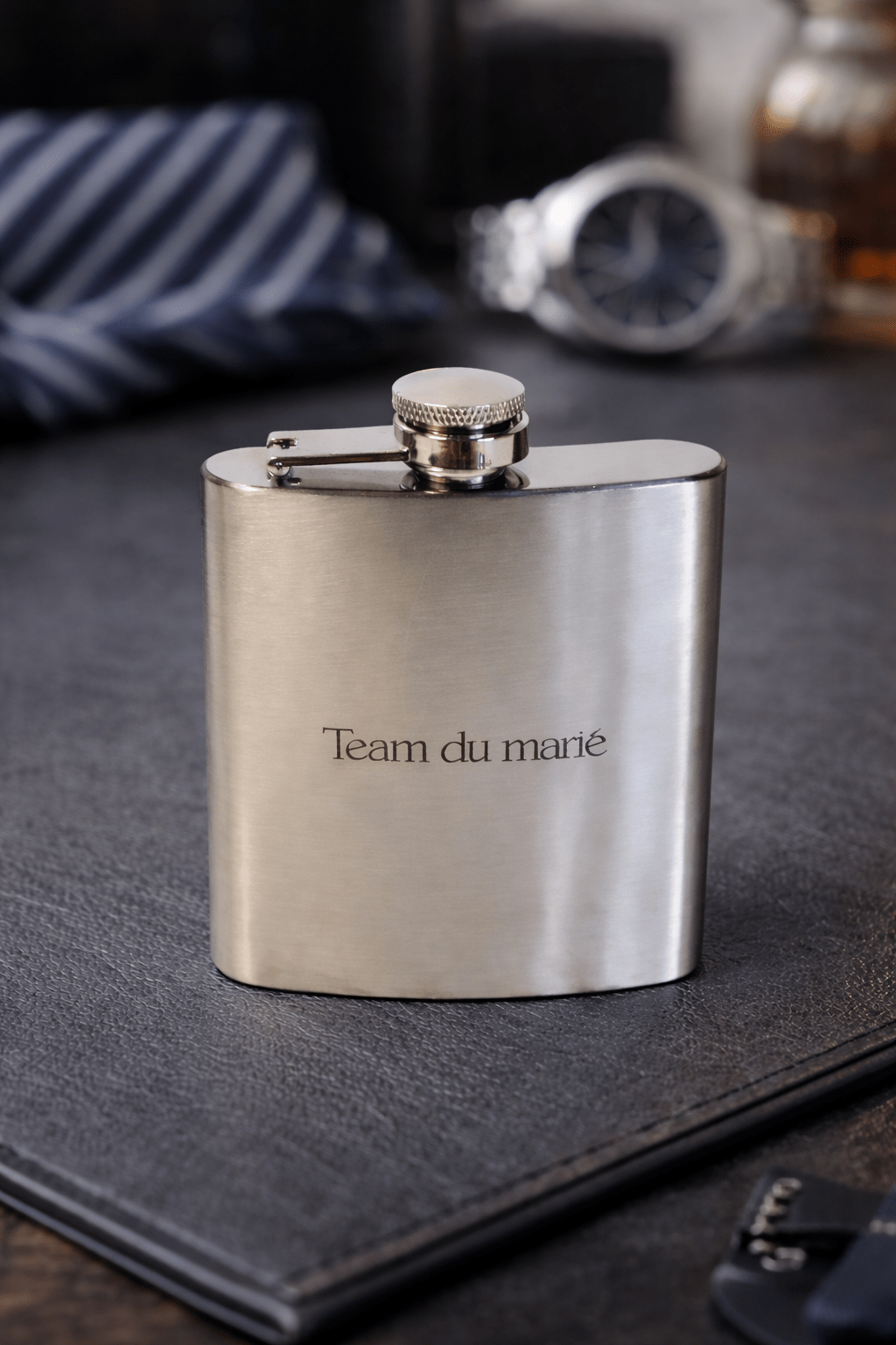 Faites plaisir à l’équipe du marié avec notre flasque d’alcool personnalisé en acier inoxydable, avec la gravure ‘Team du marié’. Doté d’une contenance de 140mL, ce contenant est à la fois pratique et élégant, offrant un moyen stylé de rester hydraté tout au long de la journée de mariage.