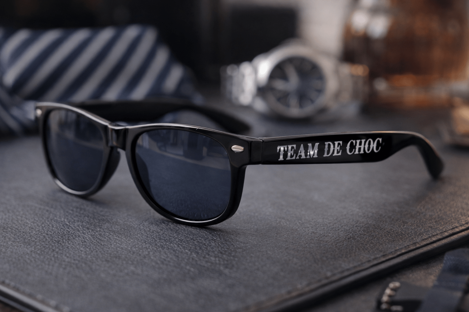 L’inscription ‘Team de choc’ sur ces lunettes noires crée une déclaration de groupe puissante. Ces lunettes incarnent l’esprit d’équipe qui entourent les moments spéciaux avant le grand jour. Cette paire est légère, moderne, branché, et tendance, tout en se protégeant du soleil.