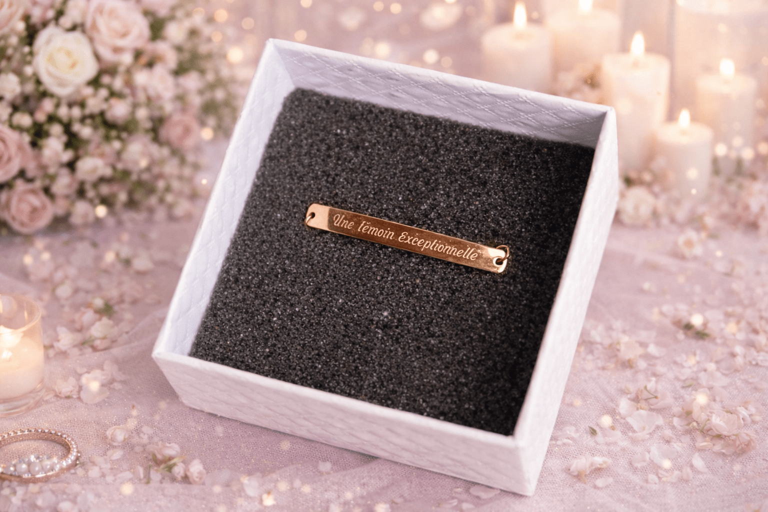 Exprimez votre reconnaissance envers votre amie exceptionnelle avec notre bracelet personnalisé. Tout d’abord ce bijou a une gravure en or rose. Ensuite nous la qualifions d’une pièce de joaillerie délicate qui allie élégance et amitié. De plus ce bijou est conçu comme le cadeau idéal à offrir, pour une occasion spéciale : la demande pour devenir témoin de la mariée. Ce bracelet sophistiqué devient ainsi le symbole d’une amitié précieuse. Un message simple pour une date unique et un amour véritable.